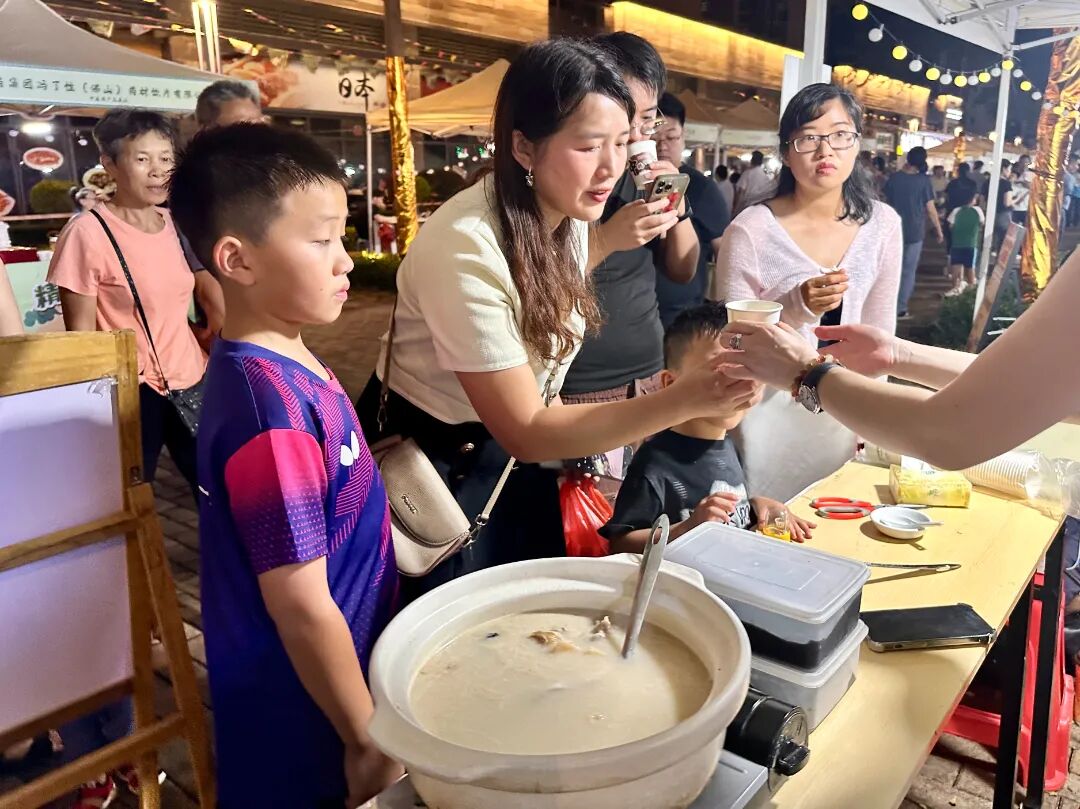饮汤,是刻在广东人骨子里的DNA。夜市现场,烹制好的天麻川芎鱼头汤香气四溢,吸引了不少市民驻足。大家不仅可免费品尝这款秋日养生汤,还能在现场学习居家熬制方法。活动引来众多市民围观和互动,洋溢着浓浓的学习与分享氛围。