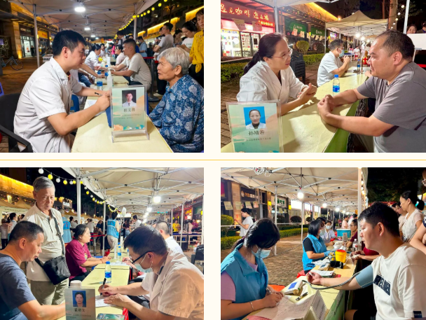 在名医专家义诊区,中山市中医院老年病科一众专家以老年人身心健康为核心,为到场老人提供全方位健康服务,还手把手教“睡前按穴”助眠法。“看到这期健康夜市专门开设了‘老年病科’,就趁着节前陪老爸来看看,尽所能让他晚年过得健康、舒心”。免费测血压血糖,讲解合理膳食、体重管理,开秋季食疗方等现场气氛热烈,前来看诊的老人络绎不绝。