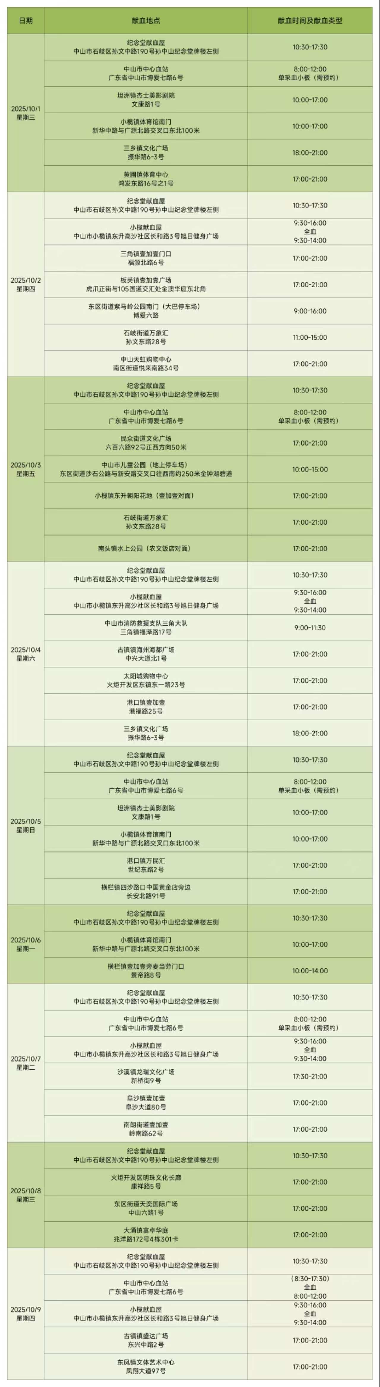 据了解,“热血真情 献礼国庆”活动将于10月1日至10月8日(国庆、中秋假期期间)在中山市各献血点举行。(献血点地点如下图)