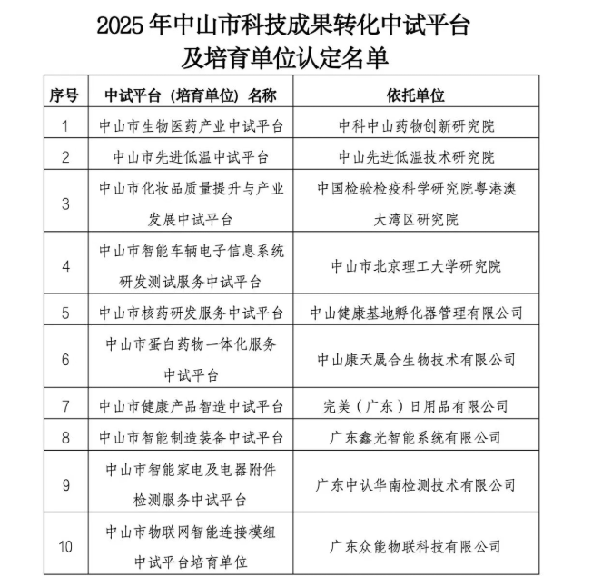 10月25日,记者从中山市科学技术局获悉,根据《中山市科技成果转化中试平台认定管理暂行办法》(中山科发〔2024〕126号),经审核,日前认定中科中山药物创新研究院、中山先进低温技术研究院等9家单位为中山市科技成果转化中试平台、广东众能物联科技有限公司1家单位为中山市科技成果转化中试平台培育单位。