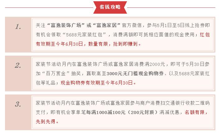 此外,家装节期间消费者还有机会享受交通银行中山分行消费补贴:单笔每满1000立减100(200封顶),名额有限,先到先得。