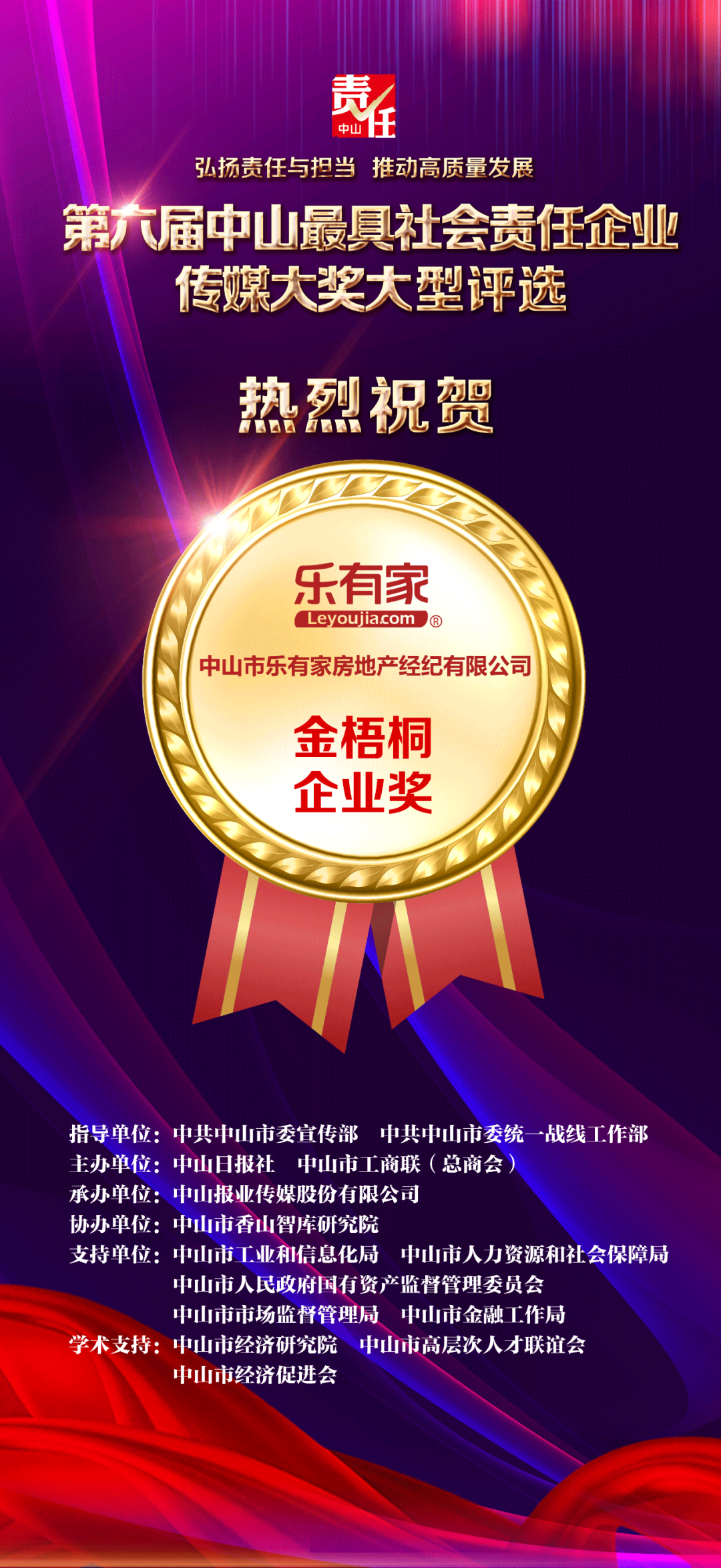 7月30日上午,由中山日报社、市工商联主办,中山传媒承办的“第六届中山最具社会责任企业传媒大奖”颁奖典礼,在中山纪念图书馆隆重举行。中山乐有家在本次活动中脱颖而出,荣获第六届社会责任企业评选的金梧桐(关爱人才类)大奖!