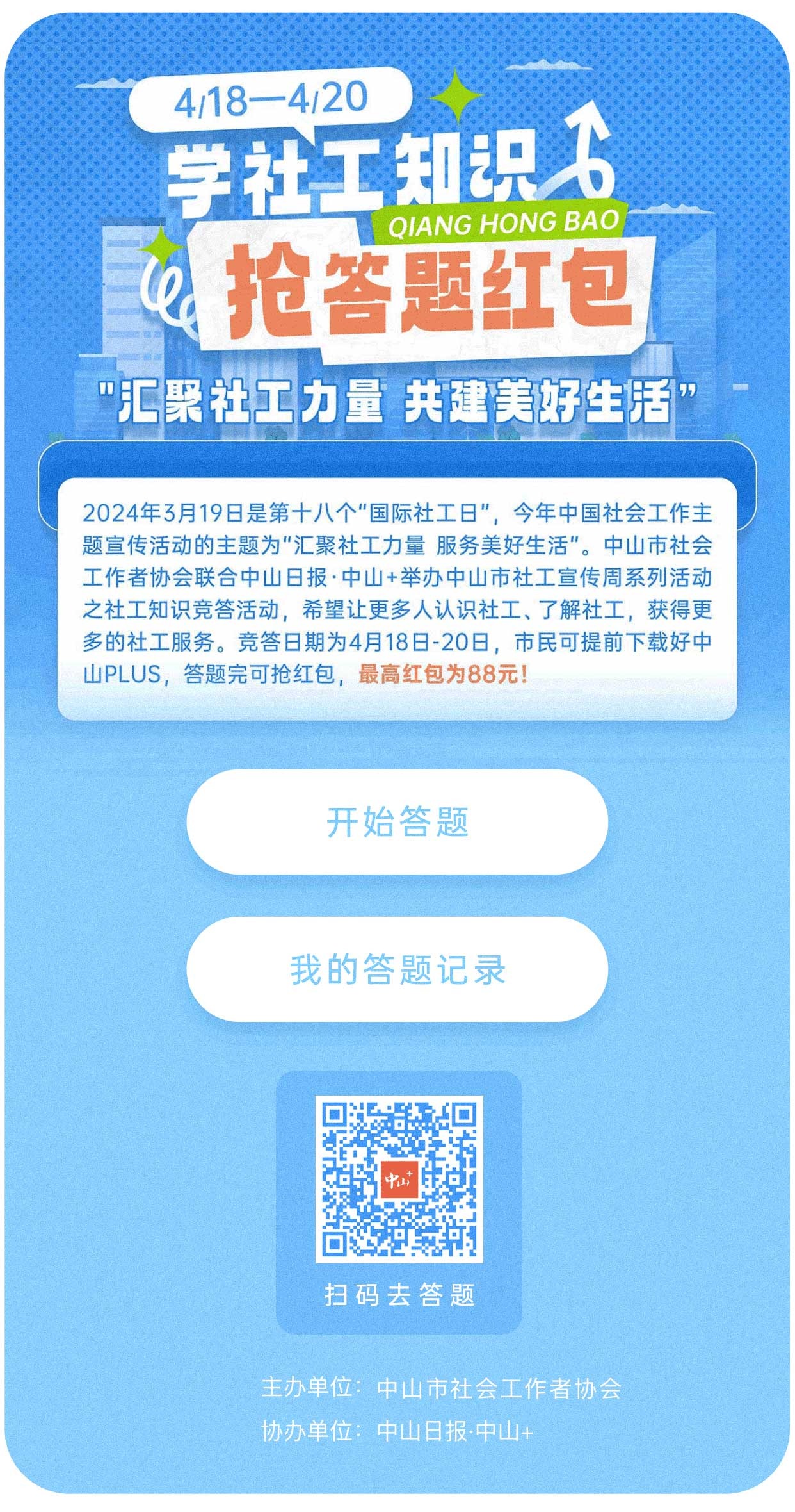 为让更多人认识社工、了解社工,体验社工服务,感受社工服务成效,中山市社会工作者协会联合中山日报·中山+举办中山市社工宣传周系列活动之社工知识竞答活动,一起为社工这份“以生命影响生命”的职业助力打气!