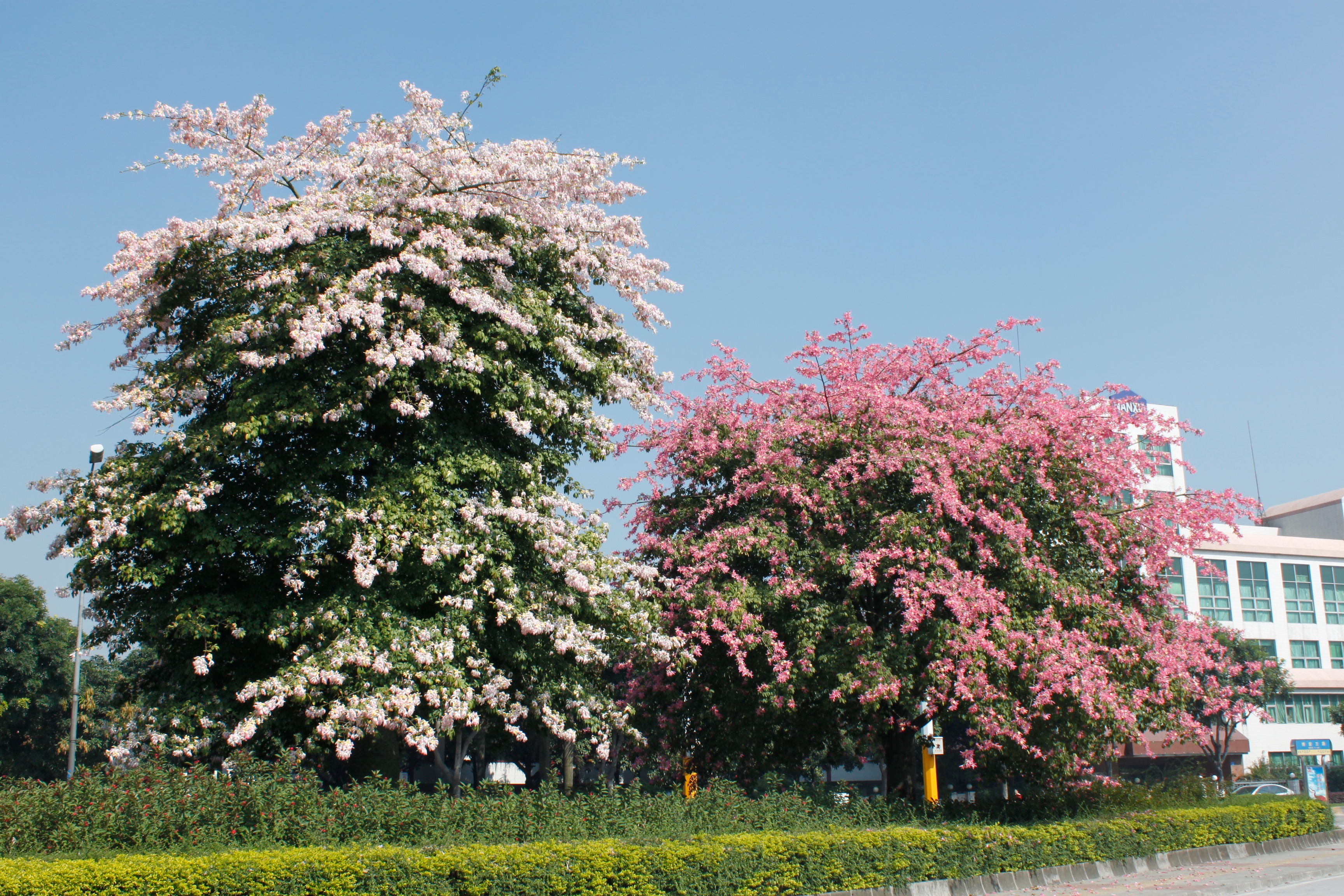 两棵开花的树,随透亮的阳光,突然闯进了我的镜头。