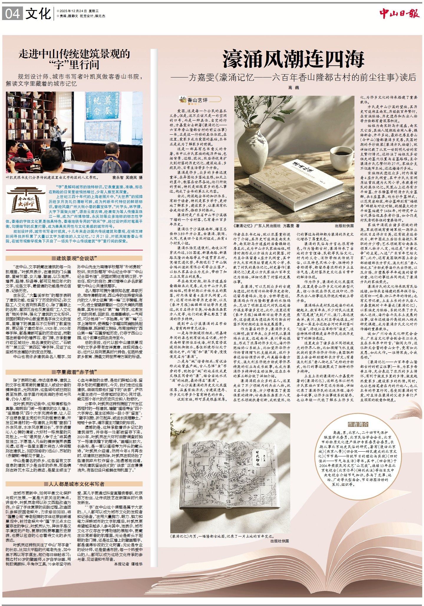 土生土长的濠涌村人方嘉雯所著的《濠涌记忆》,这部志书以村内方氏家族六百年变迁为脉络,详细记录了濠涌侨民的迁徙历程、海外奋斗故事,让侨乡往事被系统留存,也让年轻一代能了解本土侨乡文化,为侨乡文化的传承搭建了重要载体。