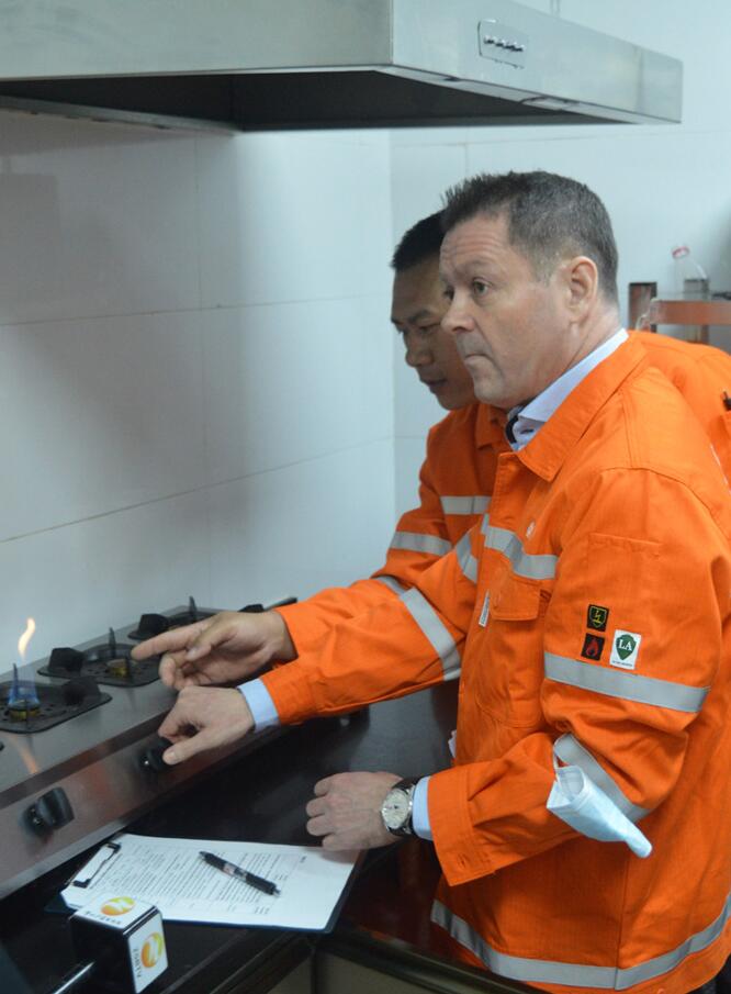 接下来,夏德农一行来到餐饮用户崖口村煲仔饭餐厅,对液化石油气器具的使用、软管的安装、安全用气等情况进行检查服务,并使用燃气检测仪,检查有无漏气隐患。