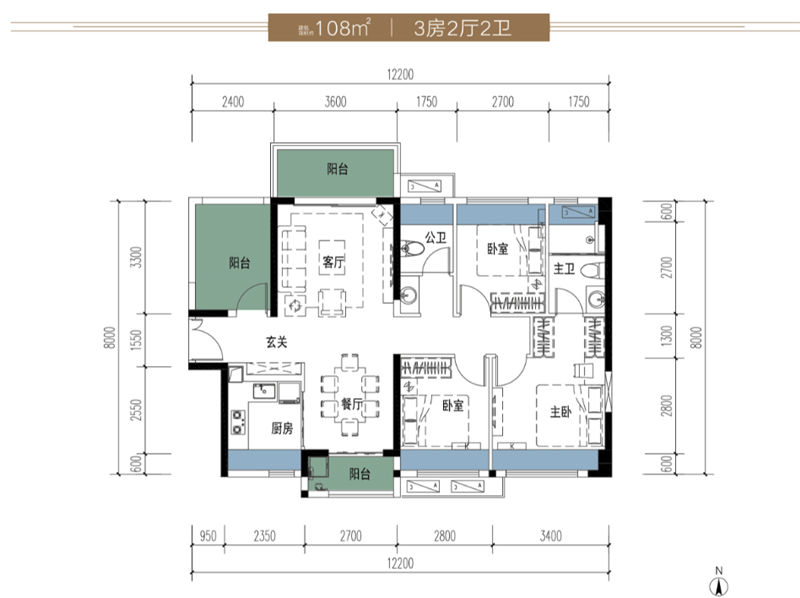 108平方米三房两厅两卫:南北通透对流,扩展的入户玄关处收纳性能更高,赠送一半面积的阳台可改造多一个房,满足几代人的日常所需,舒适与健康兼得。