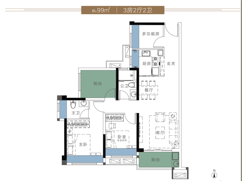 99平方米三房两厅两卫:作为100平方米以下的中小户型,除了可以做到3开间朝南,还能多一个多功能房,实现四房一步到位,绝佳的上车户型。