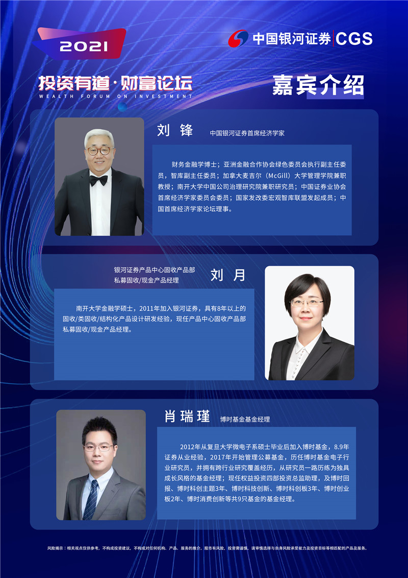 在本场中山站活动中,中国银河证券将邀请多位国内重磅嘉宾亲临中山开讲,包括中国银河证券首席经济学家刘锋、银河证券产品中心固收产品部产品经理刘月、博时基金基金经理肖瑞瑾。届时,嘉宾们将围绕当前复杂经济形势下的投资机遇、结构化产品的市场前景、科技板块投资机遇展望,以专业的角度与中山市民现场分享资本市场的真知灼见,与投资者一道共襄财富管理盛举,共话新时期投资机遇。