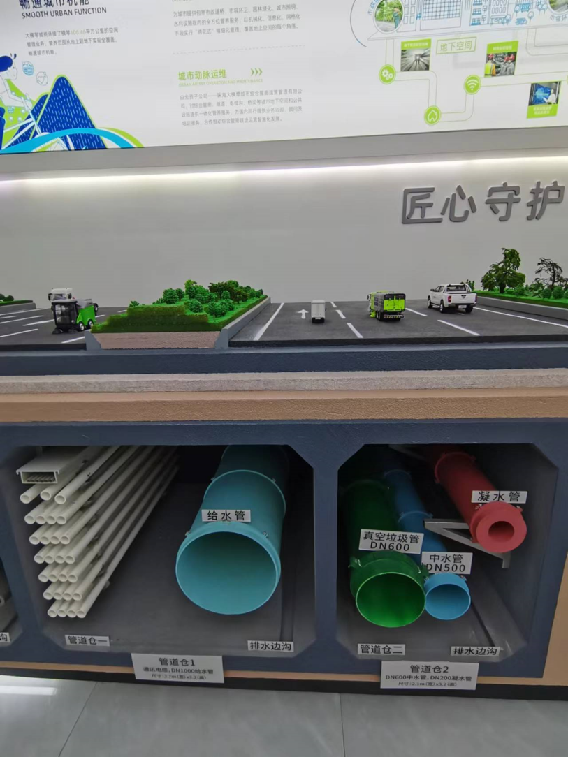 城市公共空间虽然不直接产生经济效益,但它的社会特性和功能,尤其是它所创造的文化附加值,将有助于丰富城市空间服务内涵,让群众收获实实在在的美好幸福感。图为综合管廊在城市地下的布局模型展示。