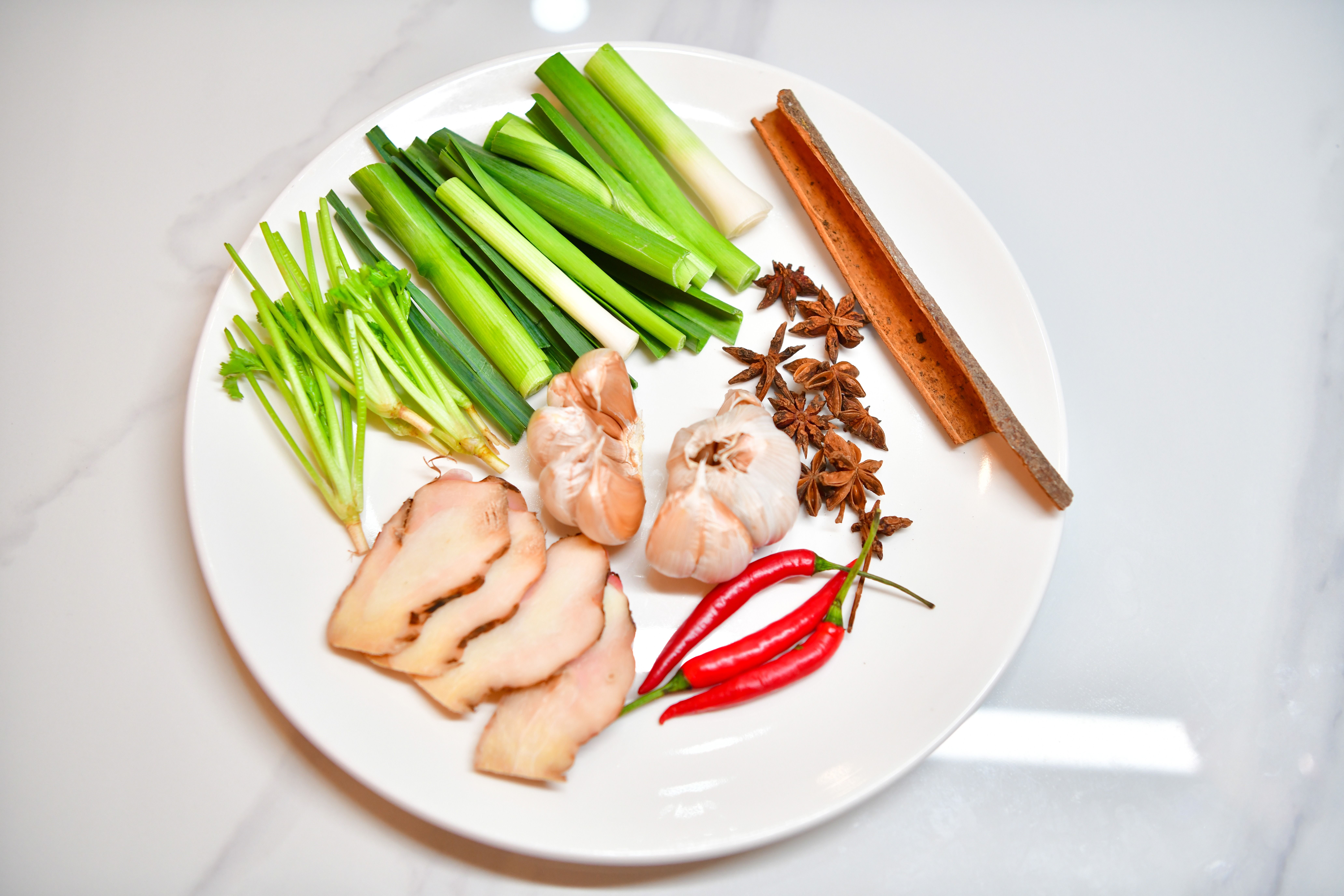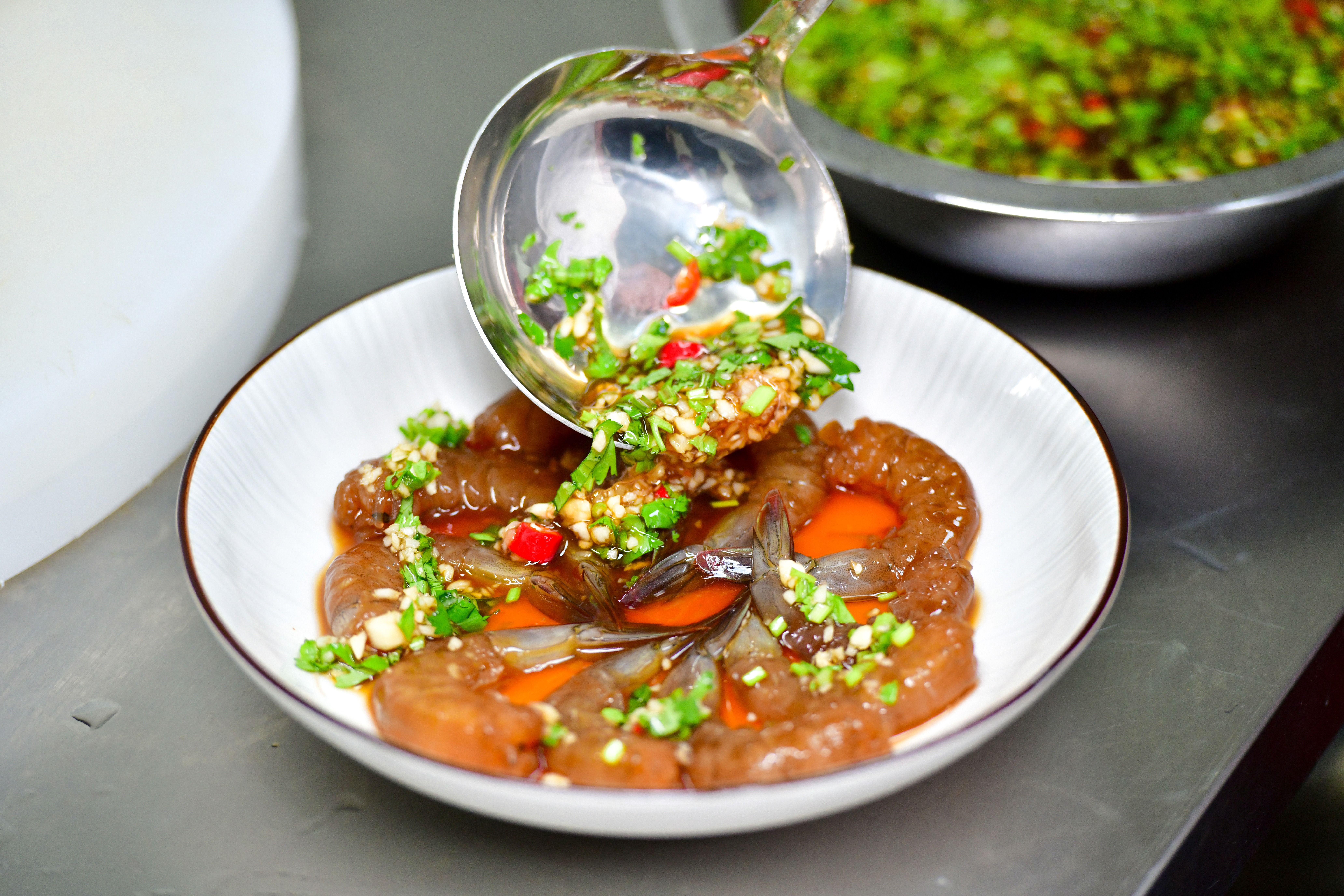 为了呈现汕头美食的丰富多彩,店家还用墨斗卵粿、炸虾枣、话梅圣女果、生腌等汕头特色小食来搭卤水火锅。生腌是一种用酱油、蒜头、香菜、辣椒、姜等众多调料腌制48小时以上而成的生海鲜料理,最大程度保留了海鲜的原汁原味,更进一步凸显了汕头人对“生猛鲜味”的热爱。