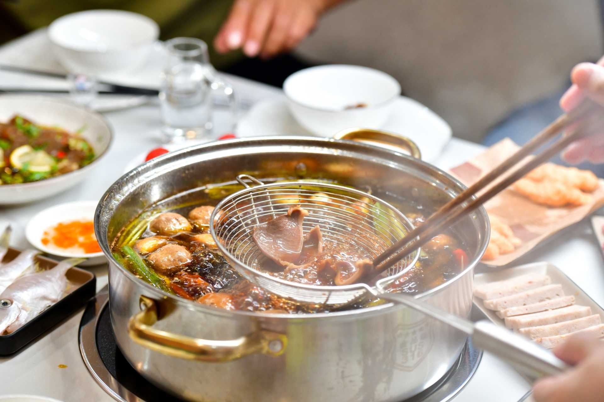 卤水火锅的灵魂在于要熬好一锅正宗的卤水汤底。店家以老鸡、猪骨打底熬汤,再搭配桂皮、八角、南姜等熬煮整整3小时,形成一锅卤香浓郁的汤底。这种汤去腥提鲜,鲜而不腻,除了涮海鲜、鹅杂,其实“万物皆可涮”。无论牛肉丸,还是豆腐、杂菜滚烫而出,吸收了汤中醇厚的味道,无需再蘸酱料。