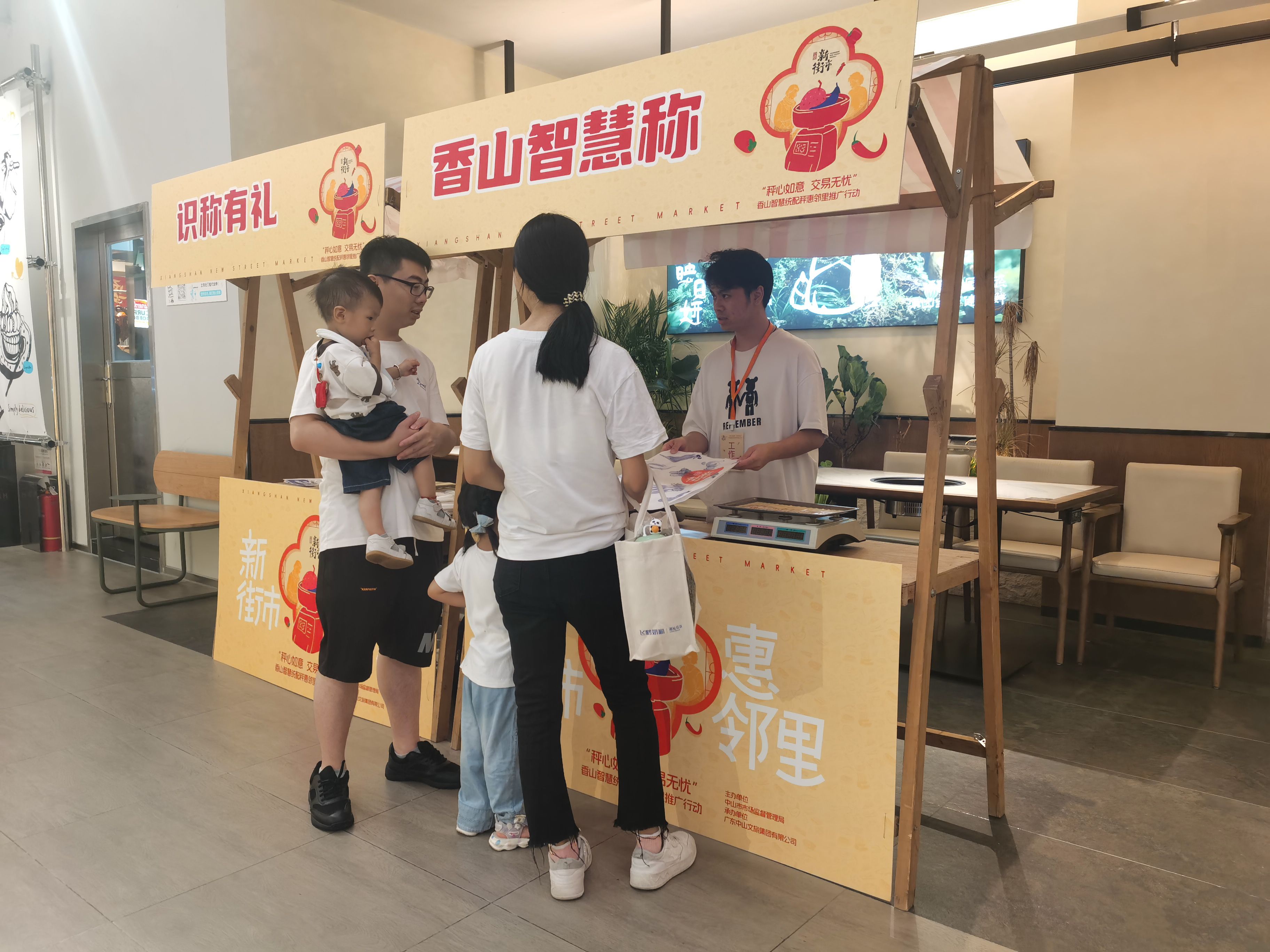 万谷VVpark一楼的“香山智慧统配秤”体验摊位前,工作人员一边演示操作,一边向市民发放环保袋与智慧秤宣传资料,引导大家熟悉新设备智慧功能。“重量、价格一目了然,再也不担心缺斤少两!”市民王先生体验后连连点头。