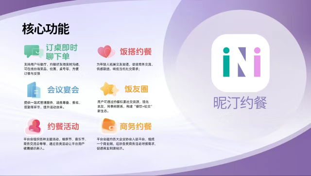 笔者了解到,昵汀约餐(Neeting)由总部设于中山东区街道的昵汀约餐科技公司自主开发和运营,其名称源于“Needing+Meeting+Dining”的组合,以“约餐+社交+情感文化”为核心定位,致力于打造便捷的掌上数字化约餐工具。