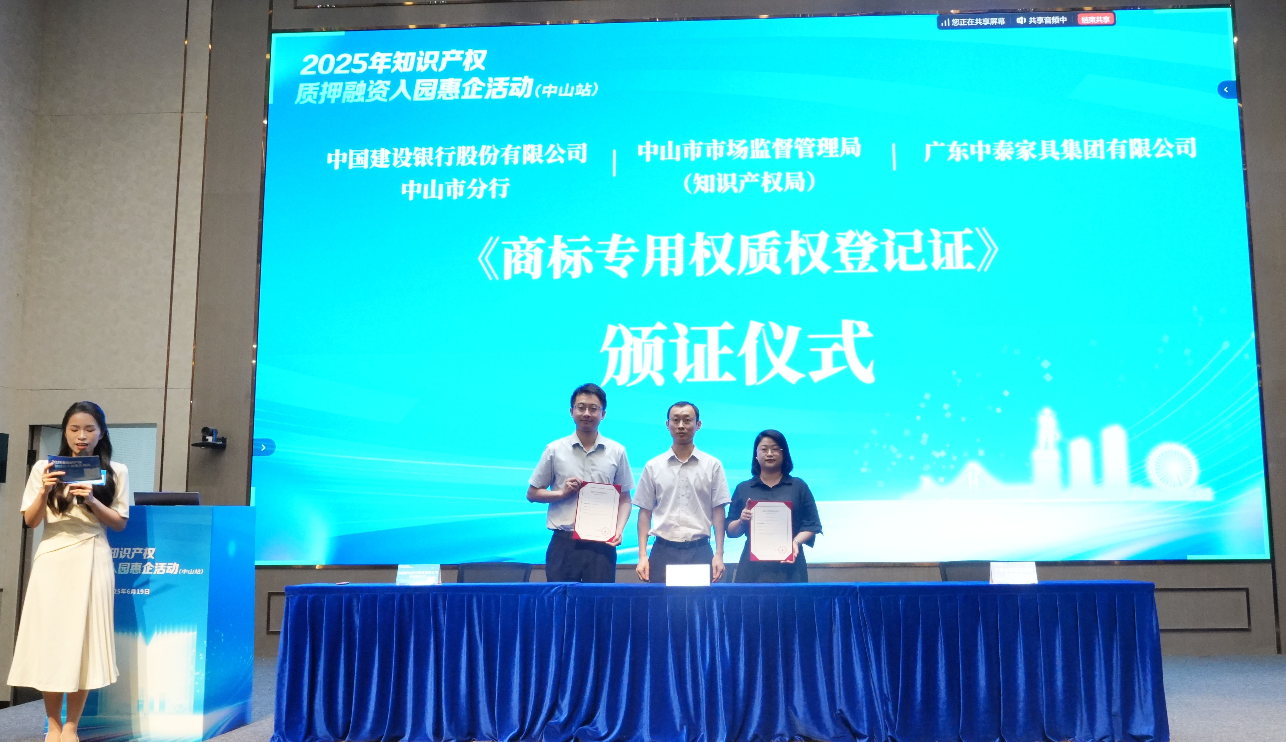 近日,中山市市场监督管理局为广东中泰家具集团有限公司颁发了《商标专用权质权登记证》,建设银行中山分行担保债权登记金额达36亿元。据悉,此次该企业质押登记的5件商标包含多个成功入选“广东省重点商标保护名录”和获评“广东高价值商标品牌”的注册商标。