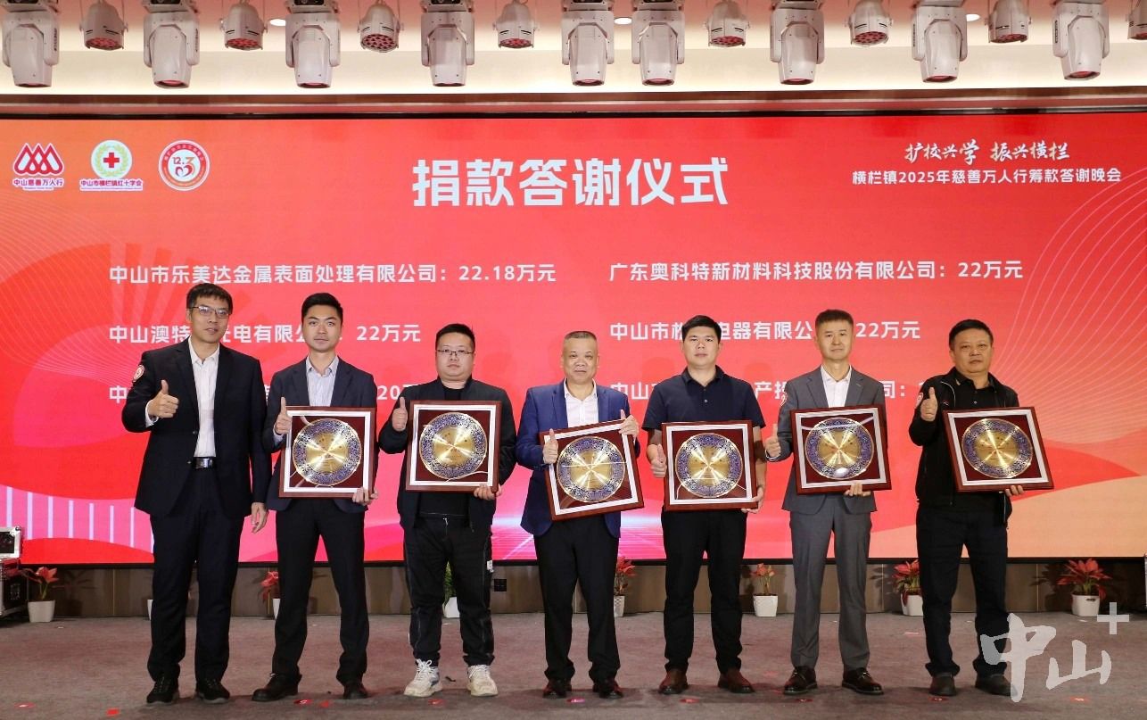 晚会现场,来自全镇的爱心企业、村(社区)及个人代表分批上台接受表彰。从捐款2万元的中小企业到捐赠超百万元的龙头企业,从扎根乡土的村(社区)到心系桑梓的乡贤代表,每一份善举都凝聚着对横栏发展的深切关怀。特别值得一提的是,广东乐美达集团有限公司再度慷慨解囊,捐赠104.5万元,累计慈善捐赠超千万元,用实际行动诠释了“达则兼济天下”的企业担当。晚会颁发的纪念铜盘以“善行圆满、厚德载物”为寓意,将传统工艺与慈善精神融为一体,成为对爱心人士最真挚的回馈。