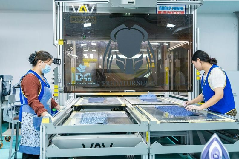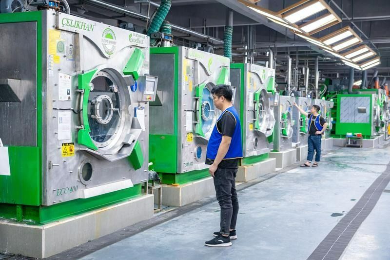 “以前洗水环节又脏又累,现在有了新设备,干净又高效。”中山市维淼环保科技有限公司车间,镭射机、臭氧机、纳米泡沫机、机械人自动喷PP机、免石洗水机等智能环保设备高效运转,来自斯里兰卡的技术工人Jogath用不太熟练的中文笑着说。