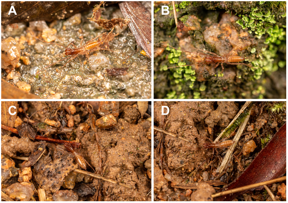 (中山巨盾蝎的活体照片,其中A-B为雄性、C-D为雌性。图片来源:论文《First record of the subfamily Megaschizominae Rowland, 1973 from China, with description of a new species of Megaschizomus Lawrence, 1969 (Schizomida:Hubbardiidae)》)