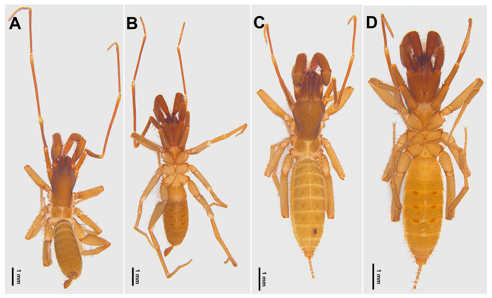 (中山巨盾蝎的标本照片,其中A-B为雄性、C-D为雌性。图片来源:论文《First record of the subfamily Megaschizominae Rowland, 1973 from China, with description of a new species of Megaschizomus Lawrence, 1969 (Schizomida:Hubbardiidae)》)