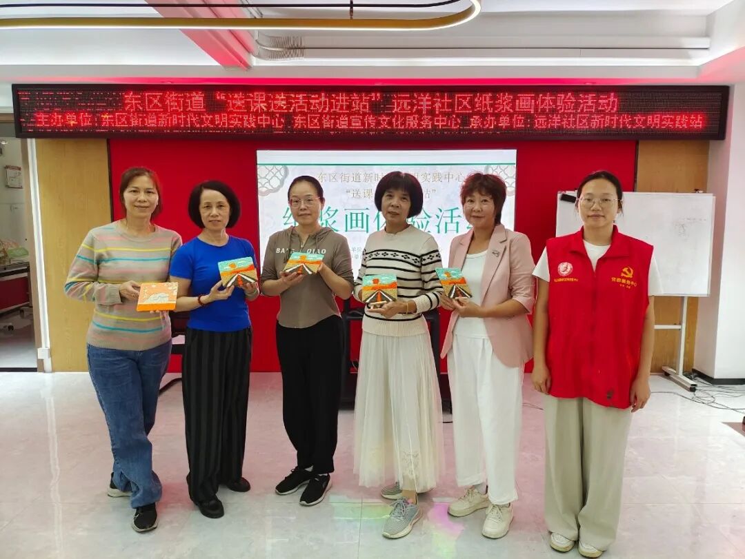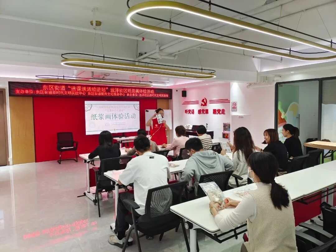 10月29日上午,远洋社区新时代文明实践站热闹非凡。在东区街道新时代文明实践中心的支持下,“送课进站”非遗纸浆画手工课在此温情开课。活动现场,志愿者老师耐心讲解纸浆画的历史渊源与制作技巧,从纸浆调色、构图设计到粘贴成型,一步步引导长者们动手创作。