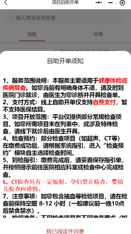仔细查看“自助开单须知”,特别关注检查前准备事项。