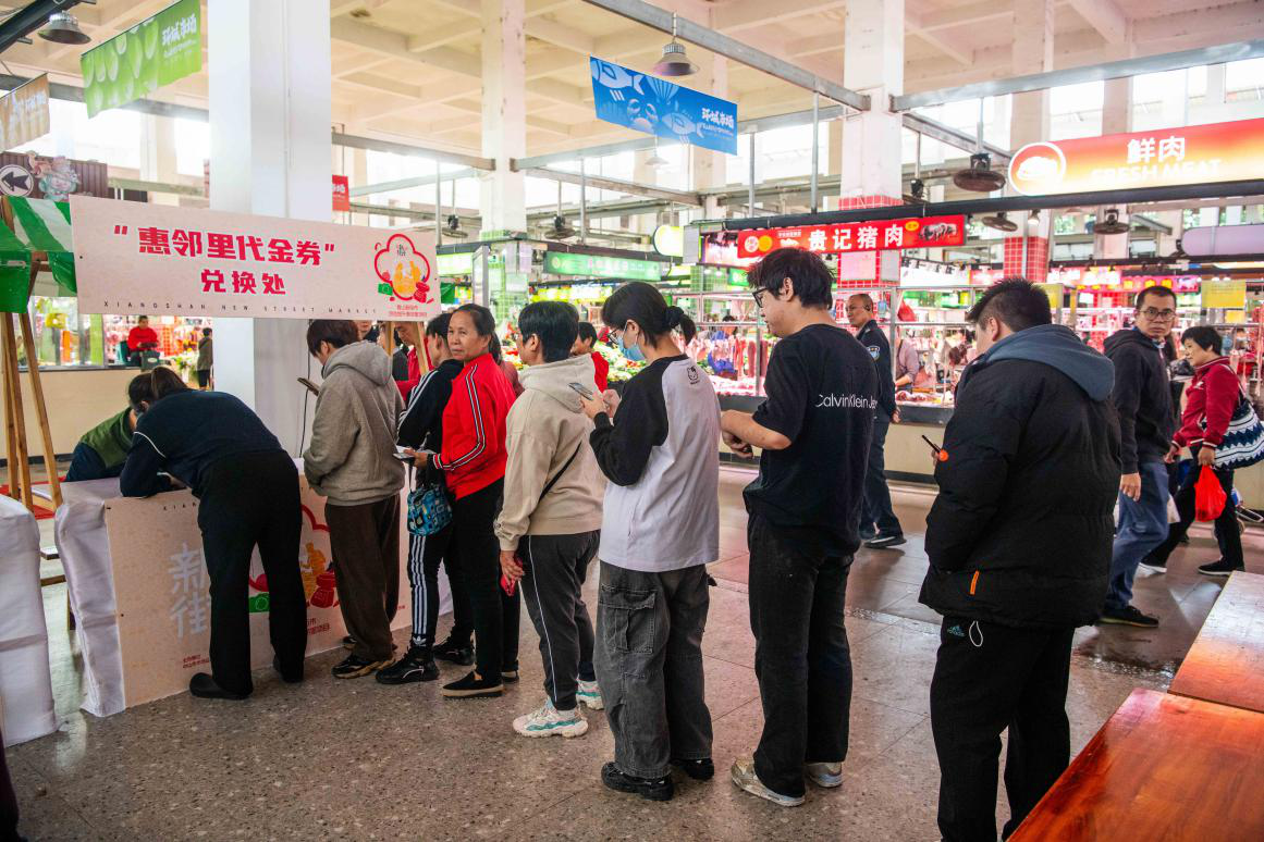 活动通过线上线下发放“满20减10”的“惠邻里代金券”的方式,吸引市民来市场消费,增加市场人气,活动覆盖副食、水果、饺子、豆制品、鸡肉、牛肉、猪肉、肉丸、三文鱼、药品、蔬菜、水产和小修小补邻里服务、餐饮等众多商户。