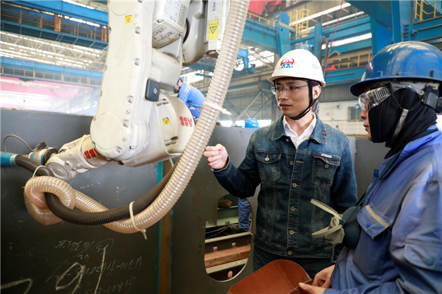 ▲夏丰勇在钢壳智能制造车间与施工人员交流块体智能焊接应用情况。(受访者供图)