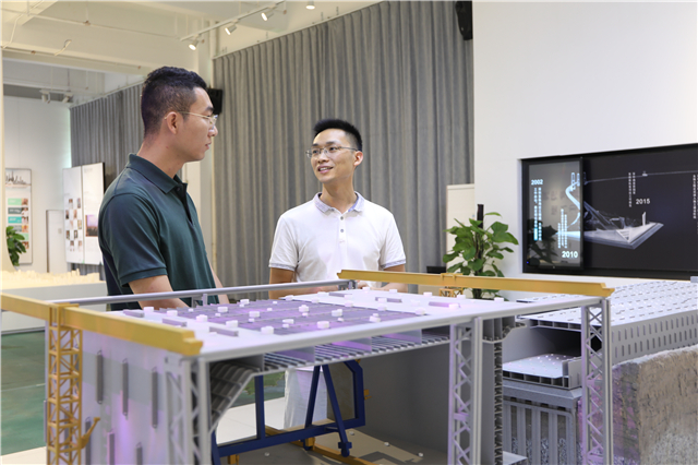 ▲夏丰勇(右)在深中通道管理中心展厅与同事交流。