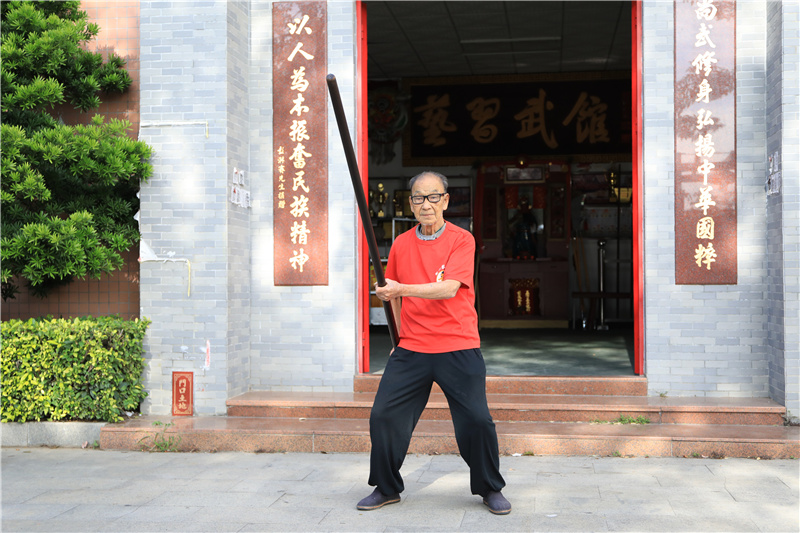 一声声“哼”“哈”,气势如虹。在中山市沙溪镇圣狮村艺习武馆,灰布鞋、黑镜框、藏青色衬衫,今年87岁的彭荣新一身朴素打扮,尽管头发花白,身板不复当年挺拔,但劈、戳、扫、点、挡等棍法使得行云流水、收放自如,正不厌其烦、反反复复地向学生们讲解分解动作。