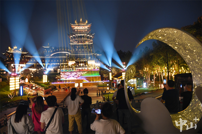 ▲10月14日晚,义乌鸡鸣阁正在上演一场灯光秀。鸡鸣阁为塔形建筑,集生态、休闲、旅游观光为一体,以山花、林木、石城景观为依托,是一座具有浓郁义乌特色的旅游生态山地景观建筑物,是义乌首例大型主体全木古建工程项目。