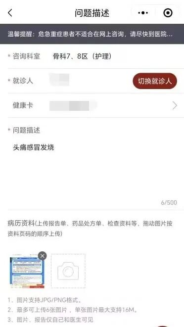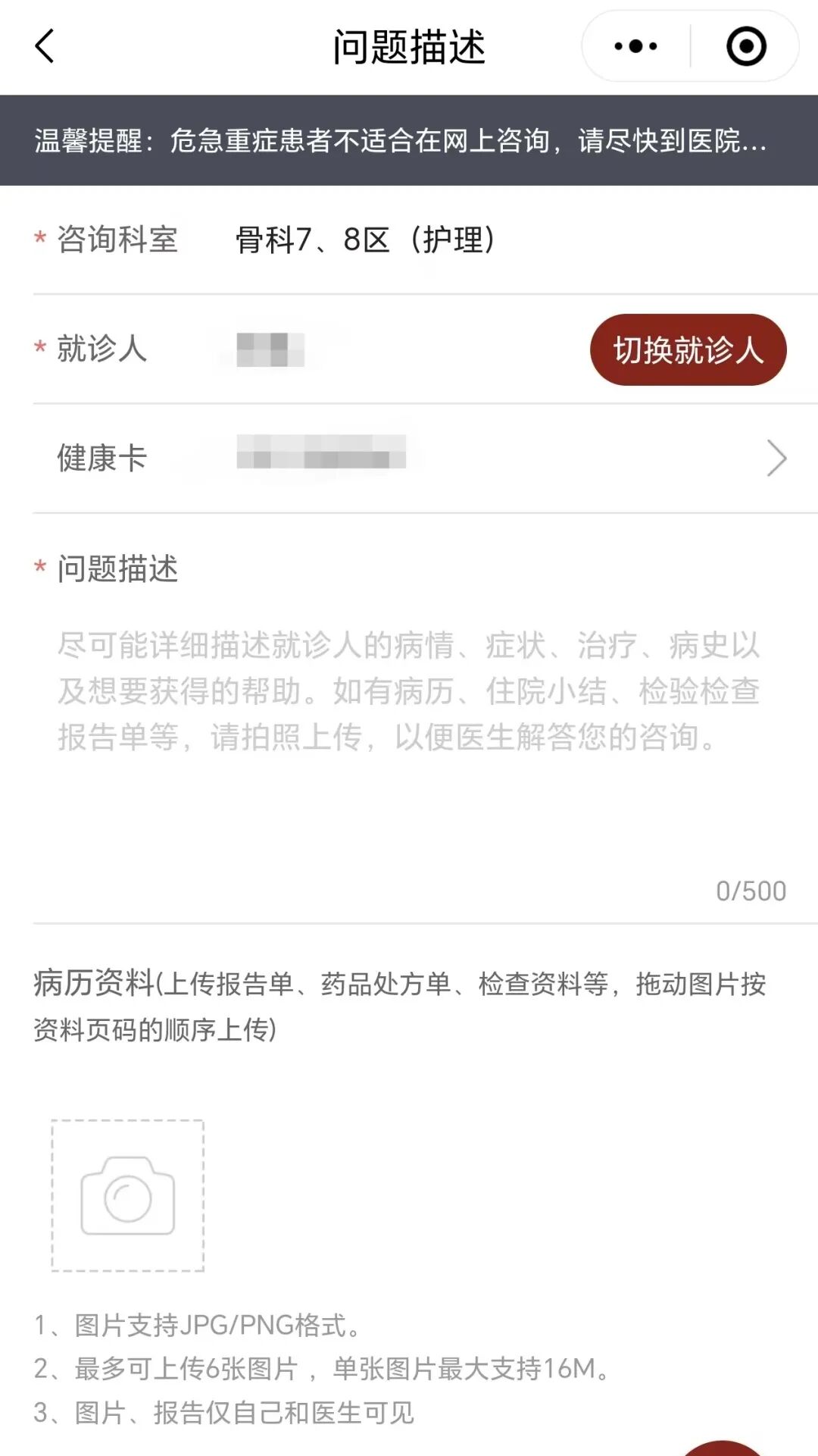 填写信息、描述病情(可上传图片),支付咨询费后即可等待护士接诊。系统会及时提醒您!
