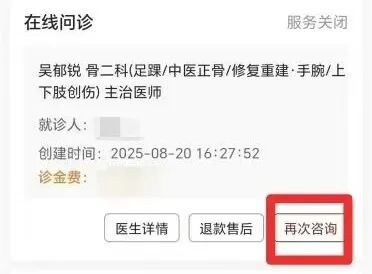 · 再次咨询:服务完成后,可点击订单中的【再次咨询】,快速找到同一位护士。