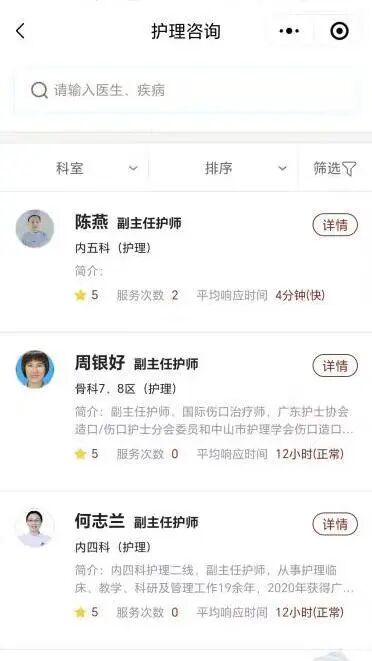 进入后,首页点击【护理咨询】 ,根据您的需求选择专科护士。