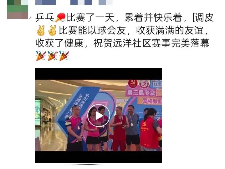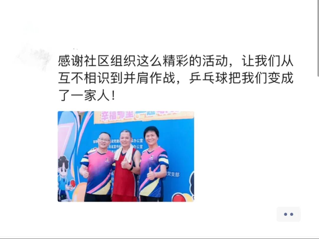 比赛期间,居民们持续在微信群里为所在小区热情助威。赛事圆满结束后,社区的微信群及居民们的朋友圈几乎被接连不断的好评“刷屏”,大家纷纷留言点赞:“感谢社区组织了这么精彩的活动!”“锻炼了身体,提高了球技!”“认识了好多新邻居,真是太开心了!”还有一位居民晒出和队友的合照,并写道:“从互不相识到并肩作战,乒乓球把我们变成了一家人。”
