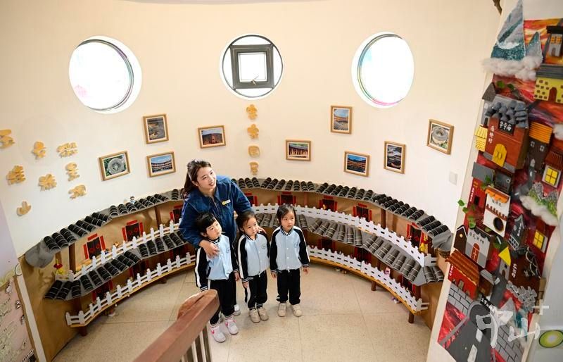 主管教育教学工作的副园长何娇认为:“环境是孩子的第三任教师。”走进幼儿园,客家文化的视觉符号无处不在:园所Logo整体采用深邃的“客家蓝”、“儿童社区”的天幕也用客家蓝布料制成、墙上装饰着客家人劳作时常用的斗笠、由师生共同用纸杯制作的手工客家围屋、五桂山文旅景观等。何娇强调,“让客家元素渗透到每个角落,实现真正的文化浸润。”