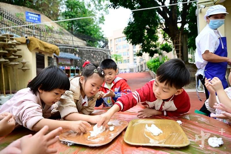 “阿妹,你搓完汤圆就放到盘子里……”10月24日上午10时许,五桂山中心幼儿园的户外灶台前,烟火气氤氲升腾,教师邹丽芬用温软的客家话,轻声提醒着正用忙碌的小手搓着客家红糖汤圆的孩子们。另一边操场上,竹竿敲击地面发出清脆的“哒哒”声,“开合开开合——”在老师响亮的口令下,孩子们灵巧地在竹竿间跳跃穿梭,一曲客家竹竿舞跳得生气勃勃。