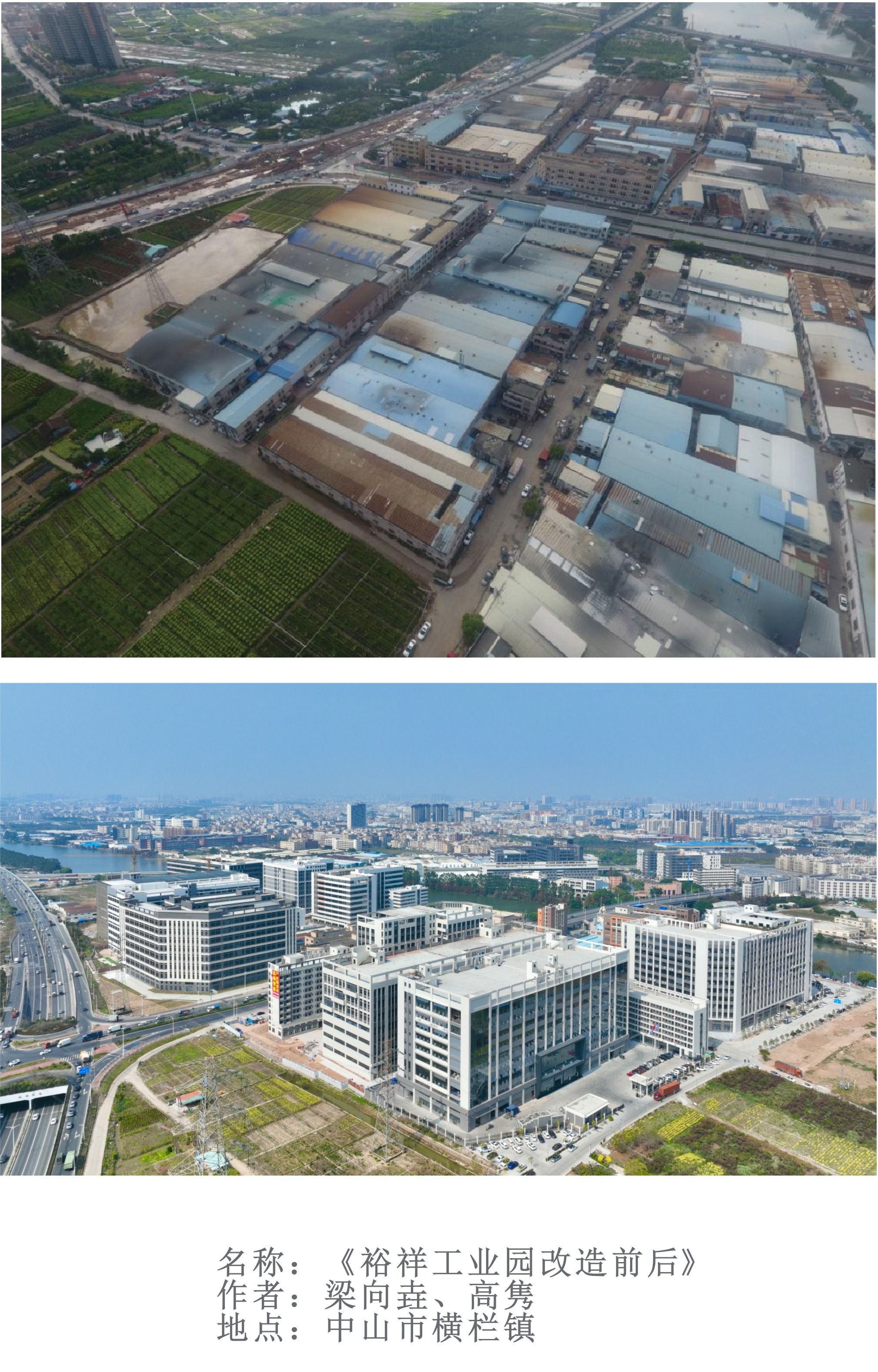 第一篇章“产业发展新动能”聚焦中山产业振兴,从“工改”攻坚的黄圃大岑、小榄绿金湾,到新质生产力勃发的海洋牧场、生物医药、低空经济;从农文旅融合的环五桂山“百千万工程”高质量发展引领区建设、香山古城保护活化,到农业产业平台横栏花木、神湾菠萝、小榄脆肉鲩……一幅幅作品定格了中山传统产业升级和加快发展新兴产业的火热场景。比如组图《裕祥工业园改造前后》,用极具对比性的照片记录下“工改”的转型奇迹,生动诠释了中山“向空间要效益、向转型要动力”的发展路径。