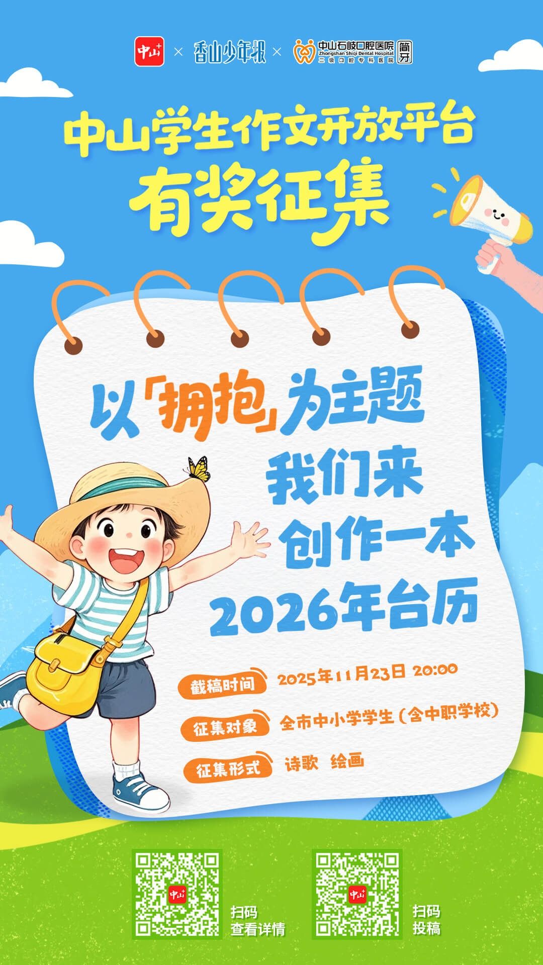爱,是看得见的心跳。在2025年进入收官阶段,中山+APP、《香山少年报》携手中山石岐简牙口腔,以“拥抱”的名义,邀请全市的孩子,用诗笔和画笔,捕捉生活中每一个温暖的拥抱瞬间。