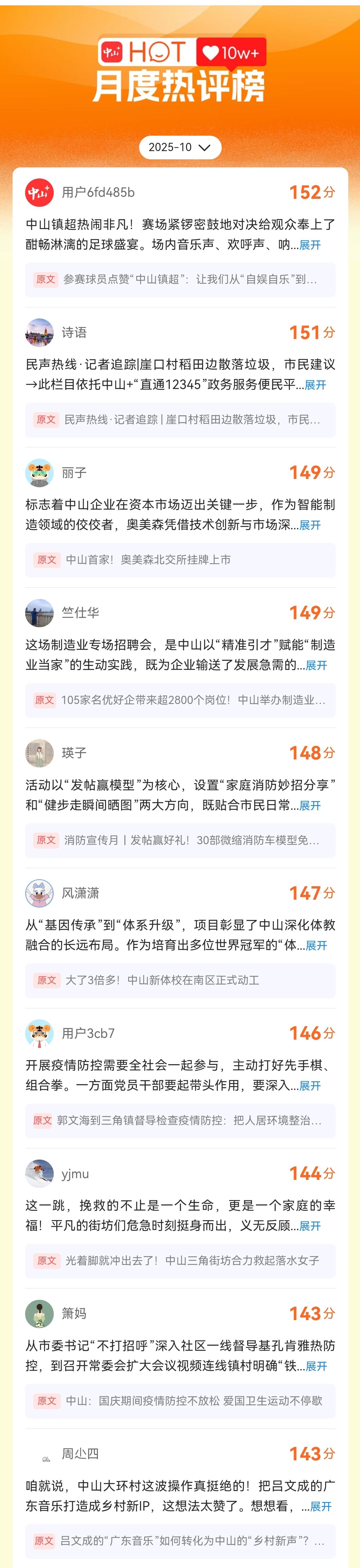 从社会热点到生活趣闻,从分享观点到犀利评论,今天我们就来盘一下在“中山+”评论区发现的“宝藏”粉丝,顺便再给进入“中山+”10月“月度热评榜”的粉丝们颁个奖。