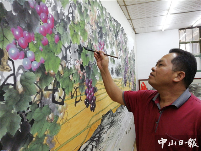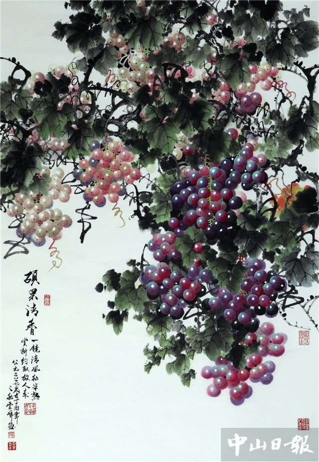 “历代名家辈出,徐渭、八大山人、吴昌硕、齐白石、王雪涛、苏葆桢、李苦禅等,要多学习;此外,我又参考了西方画技巧,把葡萄的独特之美表现出来,让葡萄色彩丰富、珠圆玉润、粒粒晶莹通透,再配以灵动的鸟、虫使得画面静中有动,更加鲜活。”在中山大柏山的陆云峰工作室,陆云峰一边画一边介绍。