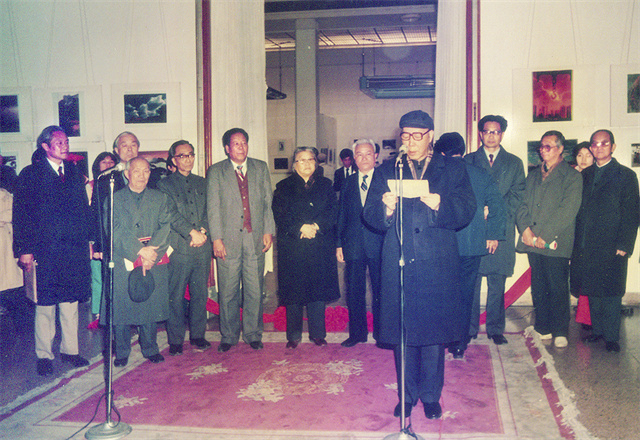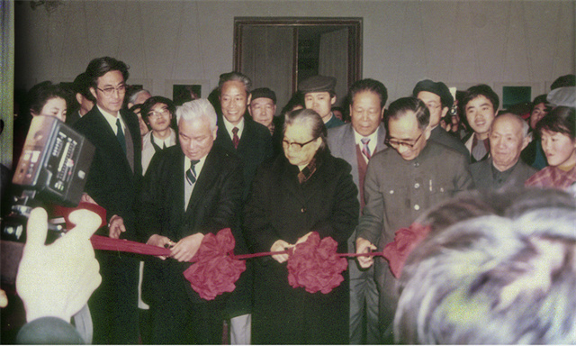 1986年,全国政协副主席康克清(前左2)、全国文联书记处常务书记赵寻(前左3)等为《祖国颂》摄影作品展开幕剪彩。肖柏成 摄