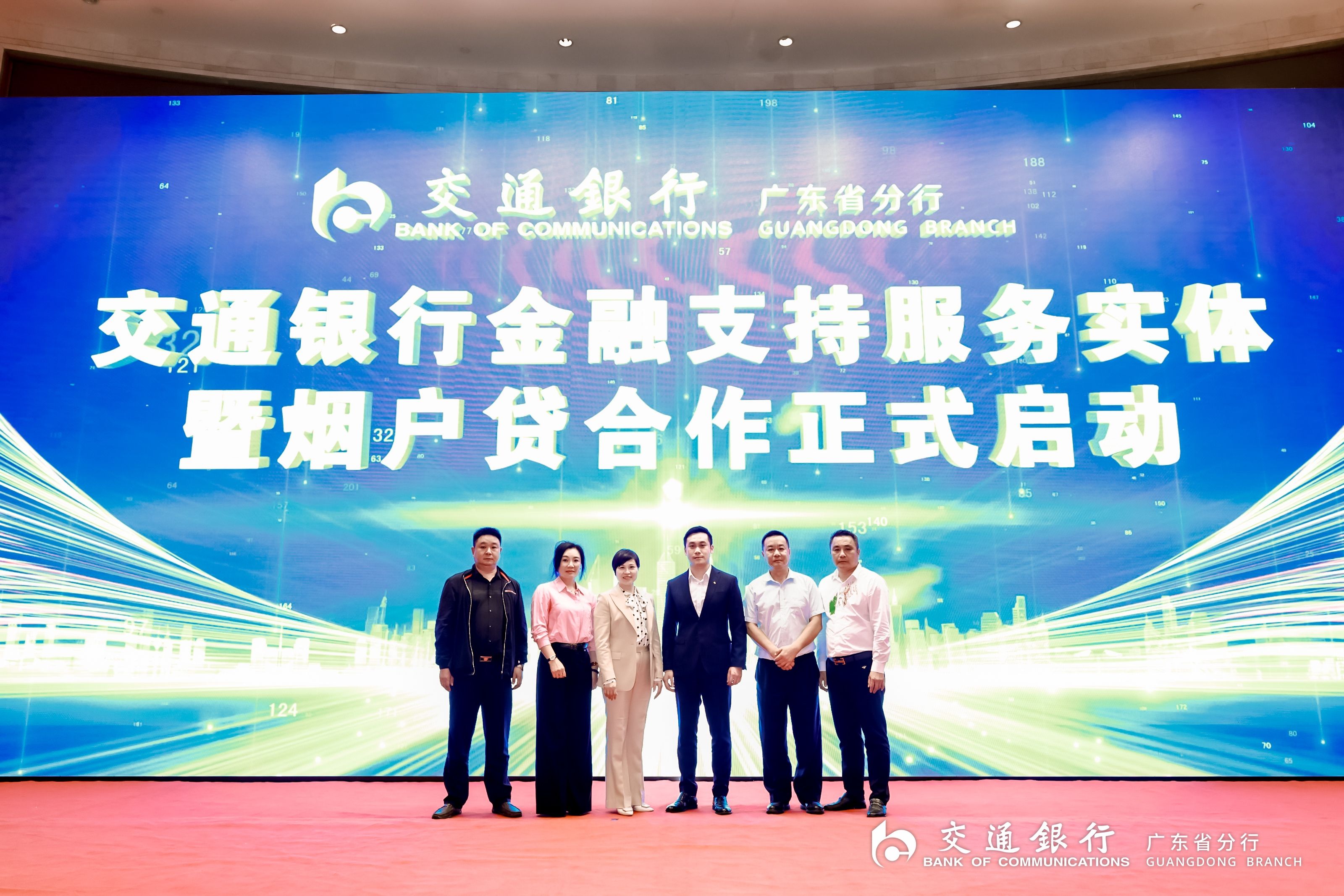 交通银行广东省分行公司部副总经理张驰、交通银行中山分行副行长李丽娜及4位客户代表共同启动交通银行金融支持服务实体暨“烟户贷”合作仪式。