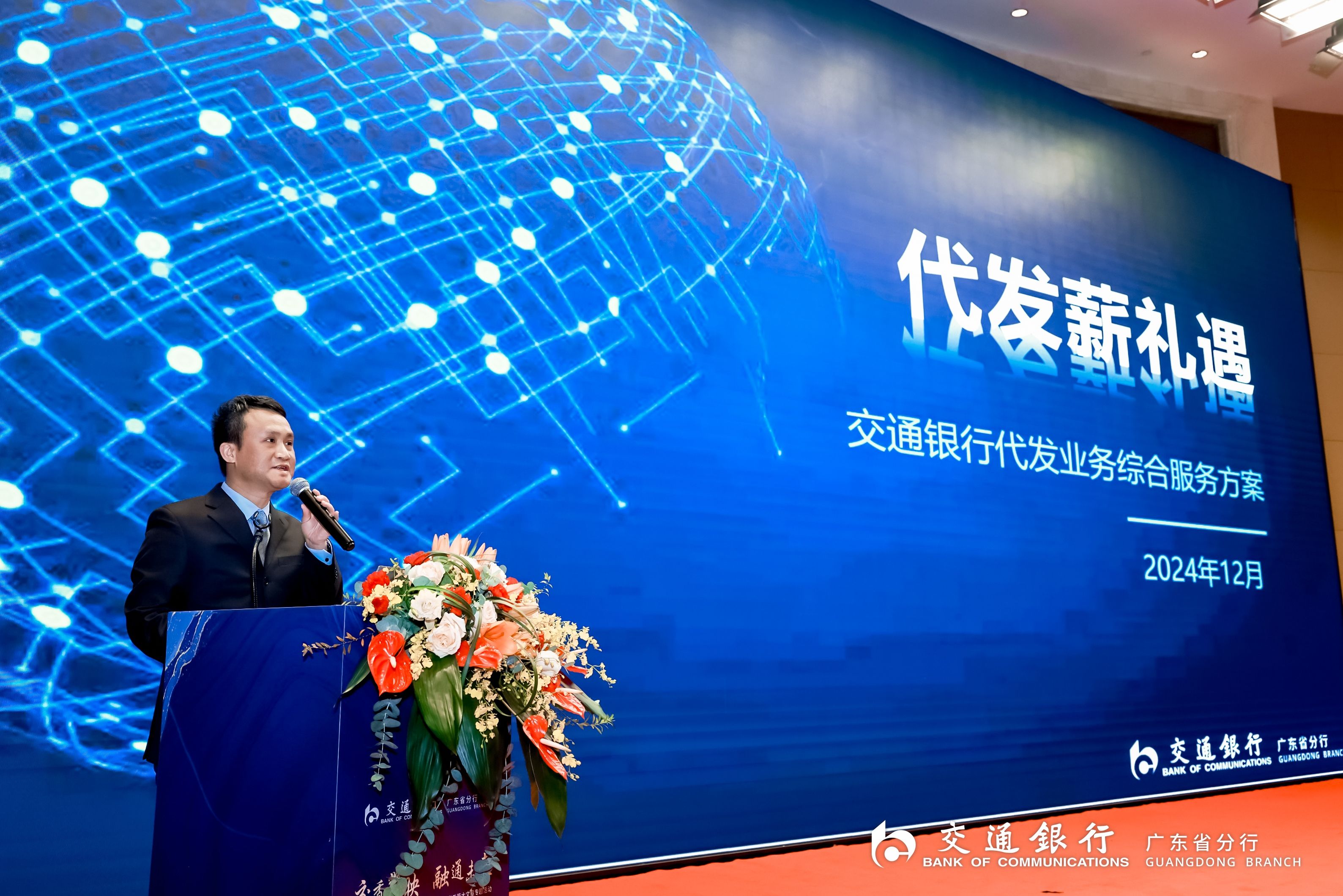 交通银行广东省分行公司部宣讲推介代发薪酬服务,将交行更全面、更便捷的代发薪酬方案优势介绍给现场客户。