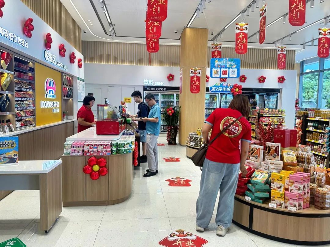 综合楼内,餐饮、购物、休息等配套设施一应俱全。各种餐饮品牌环伺中庭,为旅客提供多元选择。乐驿便利店单边经营面积从原有的84平方米提升至154平方米,不仅优化了流线设计与空间布局,还针对性增设儿童游乐区域,方便亲子家庭出行。目前,便利店在售商品825种,其中乡村振兴专柜精选48种优质农产品,为旅客提供旅途便利与农产品采购的一站式体验。