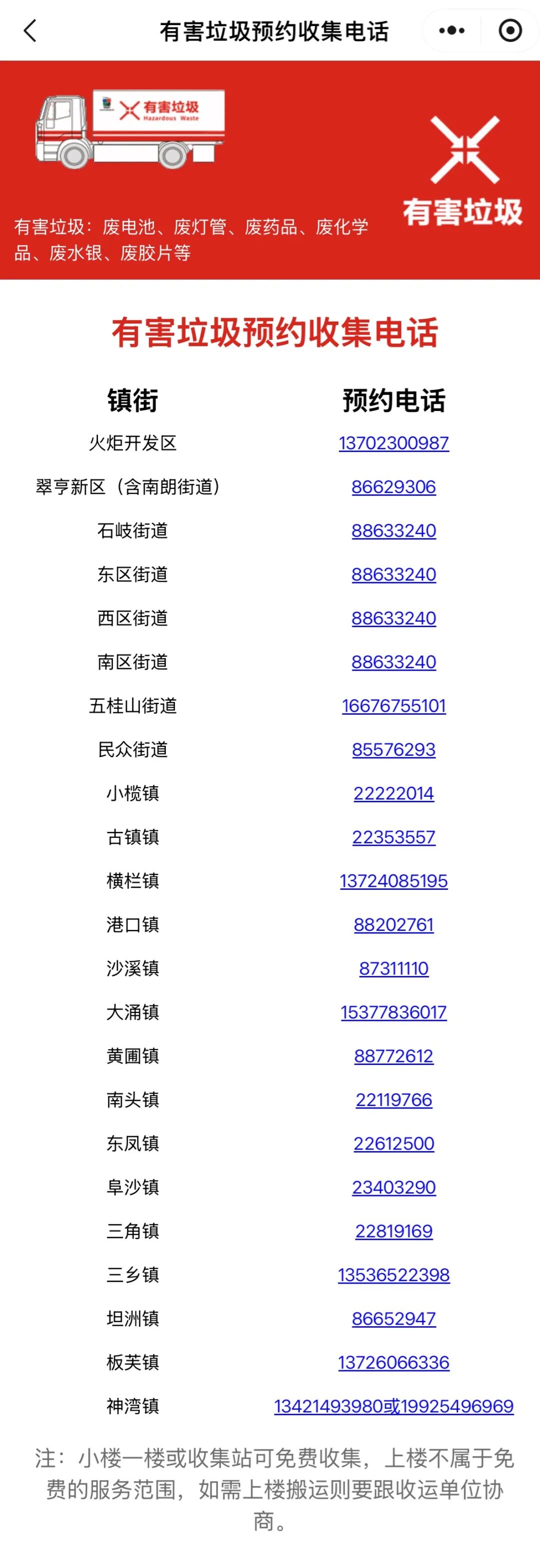 废旧灯管、过期药品、废油漆桶等有害垃圾不能乱扔?同样,在这里可以查询到各镇街的有害垃圾预约收集电话,确保这些对环境有潜在危害的垃圾得到安全、专业的处理。