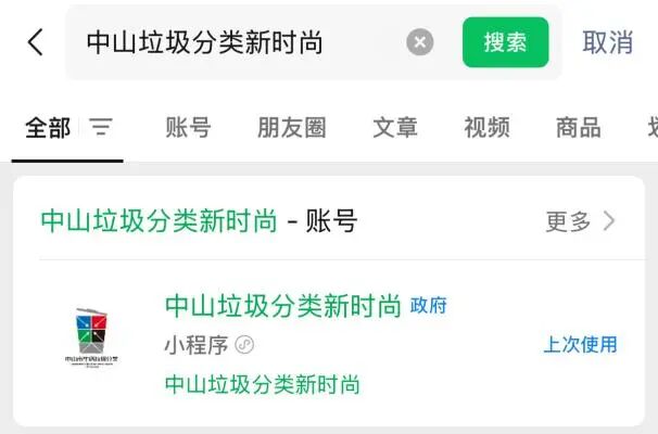 非常简单!在微信搜索框输入【中山垃圾分类新时尚】 ,点击即可进入小程序。