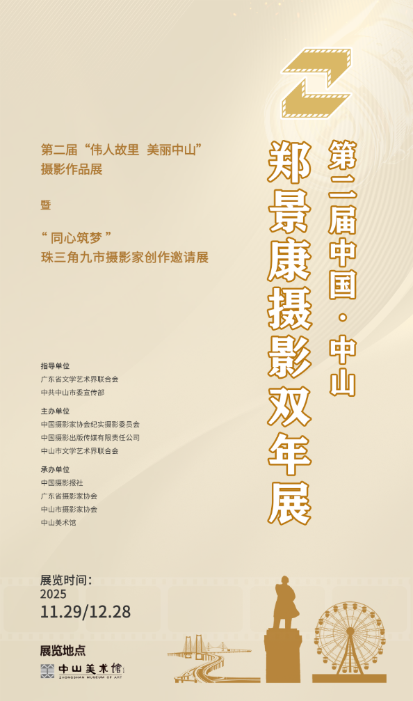 2025年11月29日上午10时,第二届中国•中山郑景康摄影双年展将于中山市美术馆启幕!展览以“为时代留影、为历史存真”为精神内核,汇集九十幅/组佳作,聚焦非遗传承、乡村振兴、青春逐梦等主题,用光影串联中山过去、现在与未来。从醉龙舞的烟火到实验室的专注,从深中同框的展望到少年航天的畅想,每帧皆为人民史诗。谨此致敬摄影先驱郑景康,诚邀影友与社会各界莅临,共赏影像里的家国温度、中山风采!