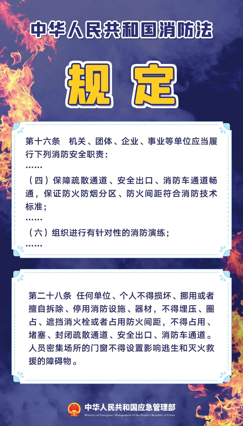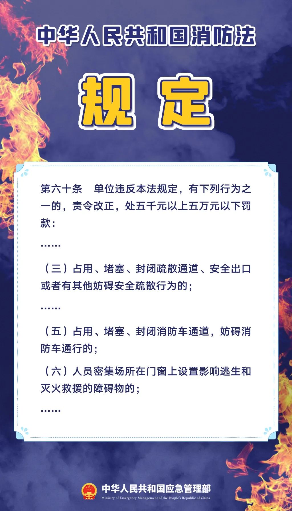 任何单位、个人不得损坏、挪用或者擅自拆除、停用消防设施、器材,不得埋压、圈占、遮挡消火栓或者占用防火间距,不得占用、堵塞、封闭疏散通道、安全出口、消防车通道。人员密集场所的门窗不得设置影响逃生和灭火救援的障碍物。