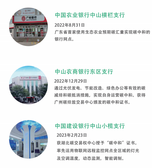 作为第三批低碳试点城市,为积极引导金融机构把绿色低碳理念落实到经营管理、业务拓展各个环节,目前中山已累计建成“(近)零碳网点”6个,实现抵消二氧化碳836吨。
