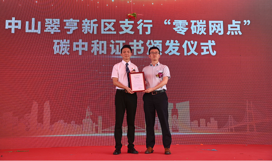 图:中山翠亨新区支行“零碳网点”碳中和证书颁发仪式